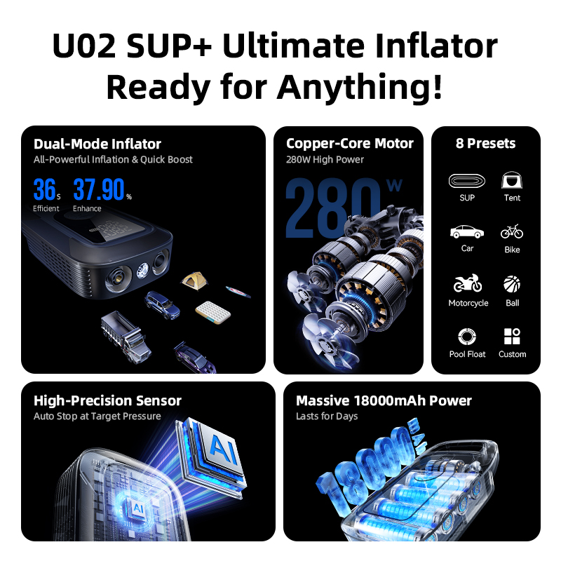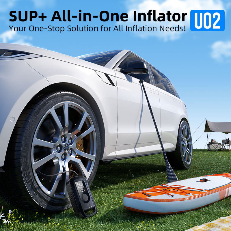 The U02 High-Flow Smart Air Pump is engineered for adventurers and home users who demand both power and intelligence. It effortlessly handles a wide range of tasks, from inflating your SUV tires to setting up your paddleboard (SUP) for a day on the water. With its robust motor and smart technology, the U02 is the ultimate, all-in-one inflation solution.
