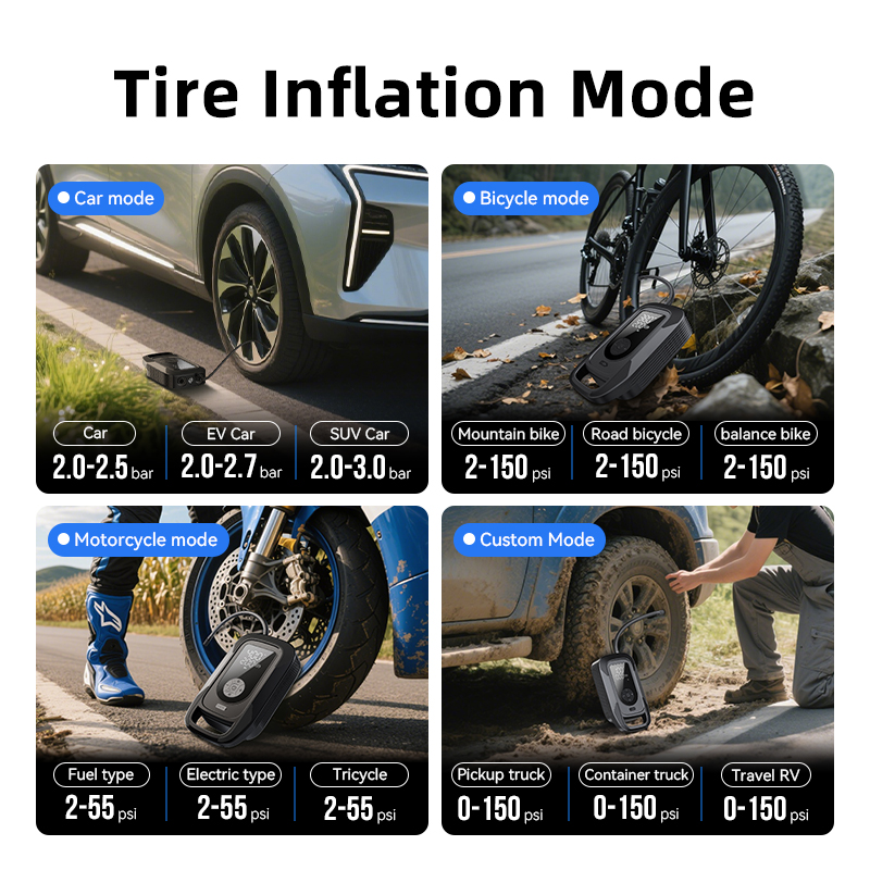 Custom Mode: For expert users, the custom mode allows you to set a specific PSI value. The pump will automatically stop upon reaching your preset, preventing over-inflation and ensuring safety.